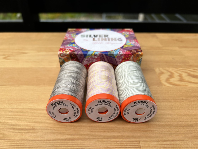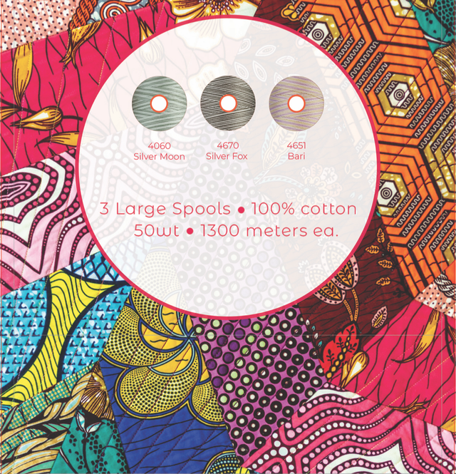 Set of 3 Large Aurifil Spools from the Tailor Made Collection. These are cotton threads in the colours: 4060 - 4670 - 4651. Perfect to sew fabrics with large colourful prints. The variegated colours will blend in easily.